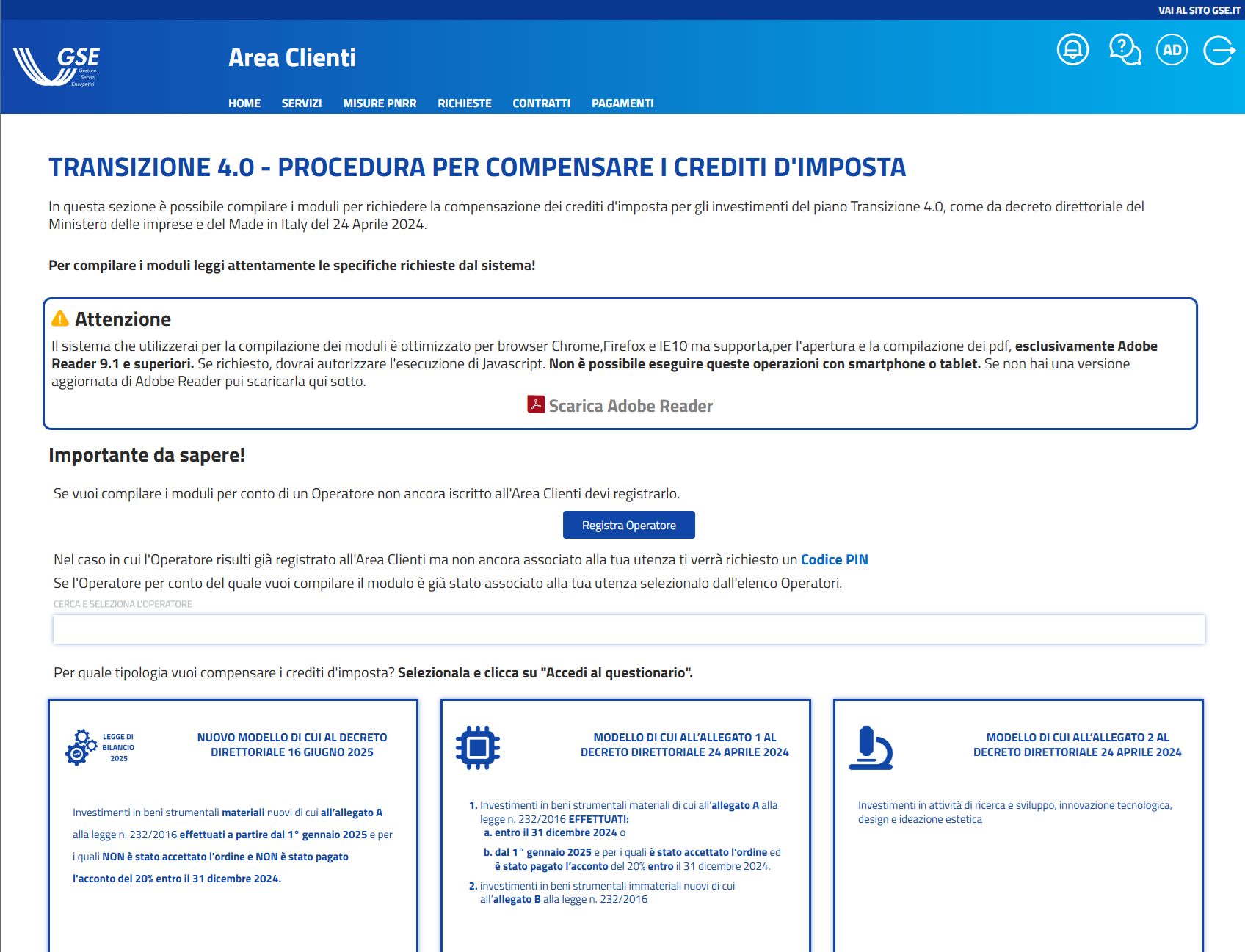 Si scarica l'istanza precompilata e la si completa con i dati richiesti. Il GSE richiede esclusivamente Adobe Acrobat Reader (versione 9.1 o superiore) per la compilazione: altri lettori PDF non sono supportati.